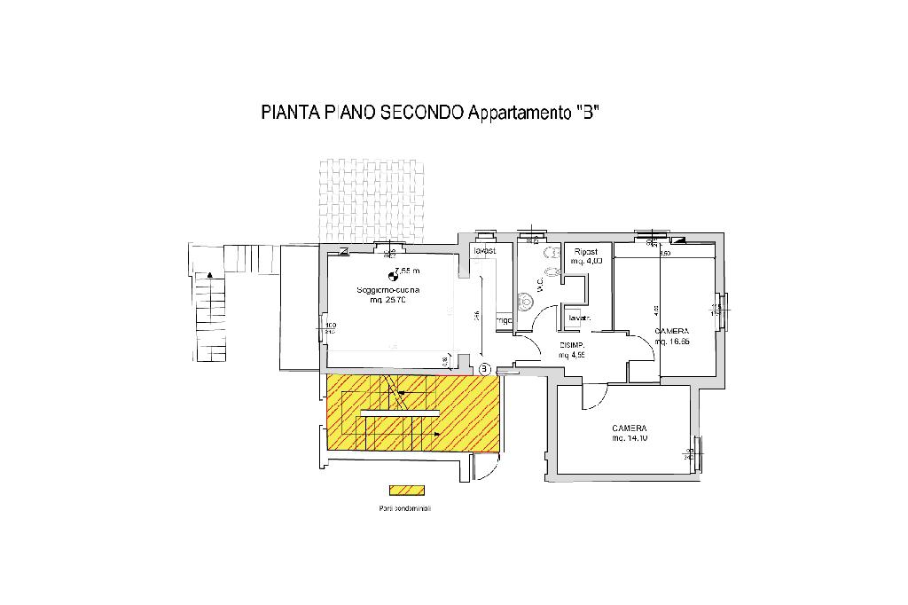 Entrando dal portone si ha la zona giorno composta da ampio e luminoso soggiorno con angolo cottura dal quale si accede, tramite portafinestra, alla terrazza della casa.